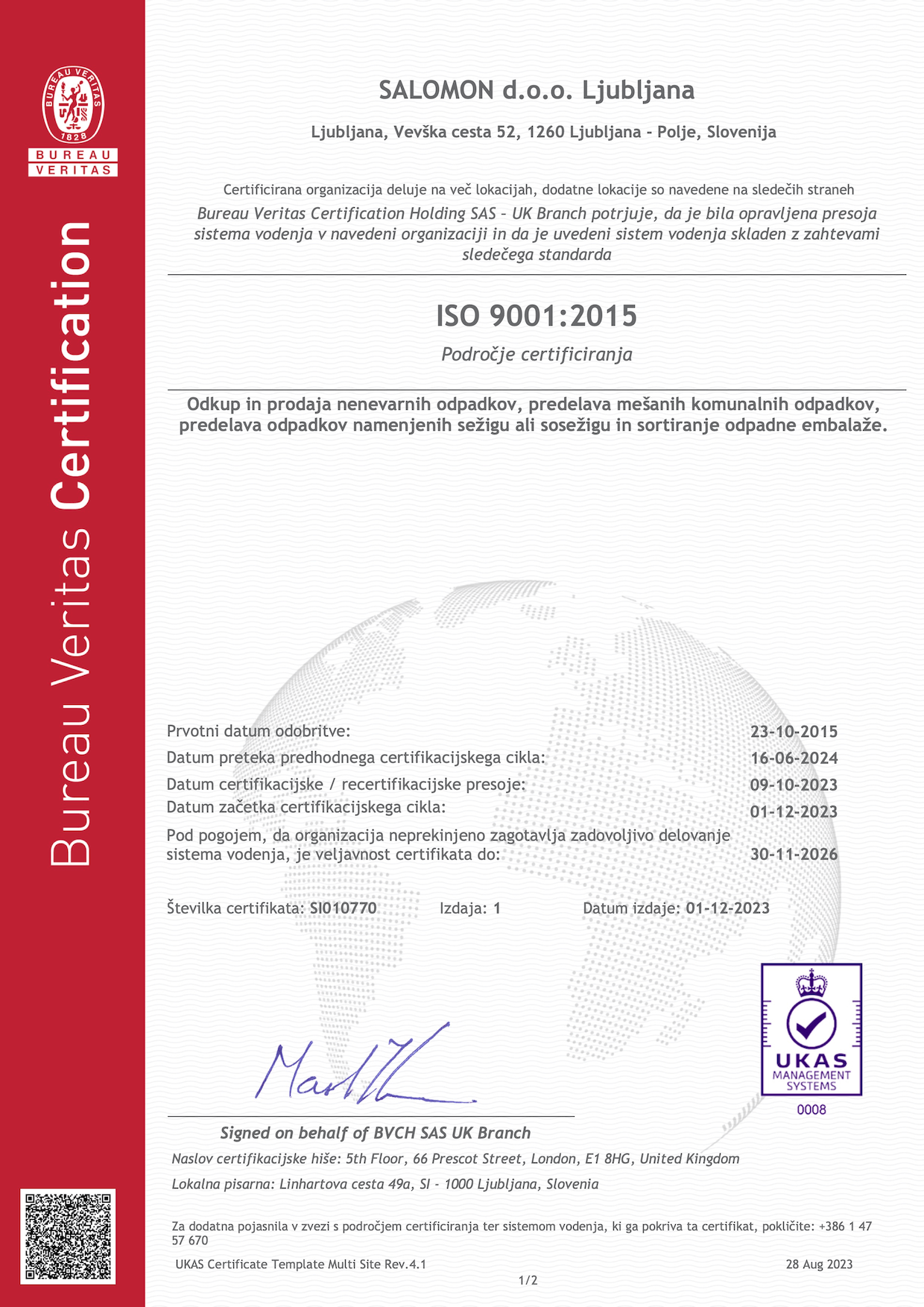 Današnji sodoben način ravnanja z odpadki in raven kakovosti naših storitev sta usklajena z mednarodnimi standardi ter upoštevata slovensko in evropsko zakonodajo.